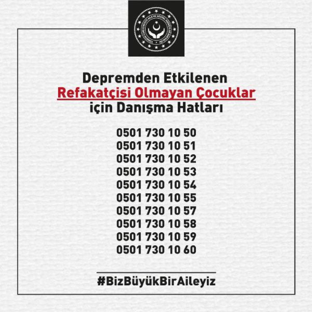 Öte yandan Aile ve Sosyal Hizmetler Bakanlığı'nın Twitter hesabından yapılan açıklamada da "Afet bölgelerinde aile ve yakınlarına ulaşılamayan çocuklarımız için bir çağrı merkezi kurduk" denilerek, çağrı merkezi numaraları paylaşıldı.