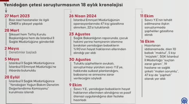 16 Eylül'de bebek ölümlerinde illiyet bağı saptandı. Müfettişler, 28 Eylül'de hastanelerin kapanma önerisini sunuyor. Sağlık Bakanlığı müfettişleri Teftiş Kurulu'na ve savcılığa bildiriyor.