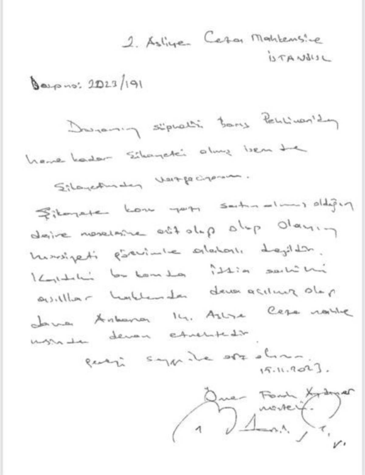 "Şikayete konu yazı satın almış olduğum daire meselesine ait olup, olayın husisiyeti görevimle alakalı değildir. Kaldı ki, bu konuda iddia sahibi asıllar hakkında dava açılmış olup, dava devam etmektedir. Her ne kadar şikayatçi olmuş isem de şikayetimden vazgeçiyorum."