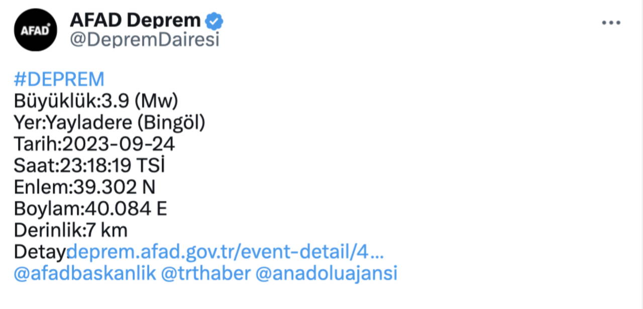 Afet ve Acil Durum Yönetimi Başkanlığı (AFAD), Bingöl'ün Yayladere ilçesinde 3.9 büyüklüğünde bir deprem meydana geldiğini duyurdu.