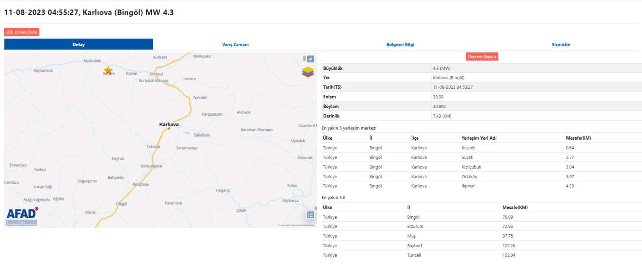Afet ve Acil Durum Yönetimi (AFAD) Başkanlığından yapılan açıklamada, Riçhter ölçeğine göre saat 04.55'de merkez üssü Bingöl'ün Karlıova ilçesi olan 4.3 büyüklüğünde deprem meydana geldi.