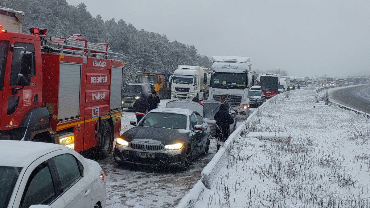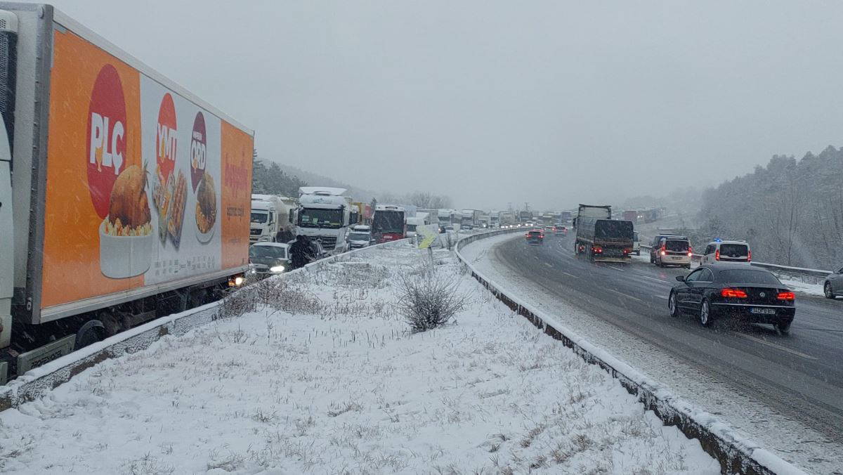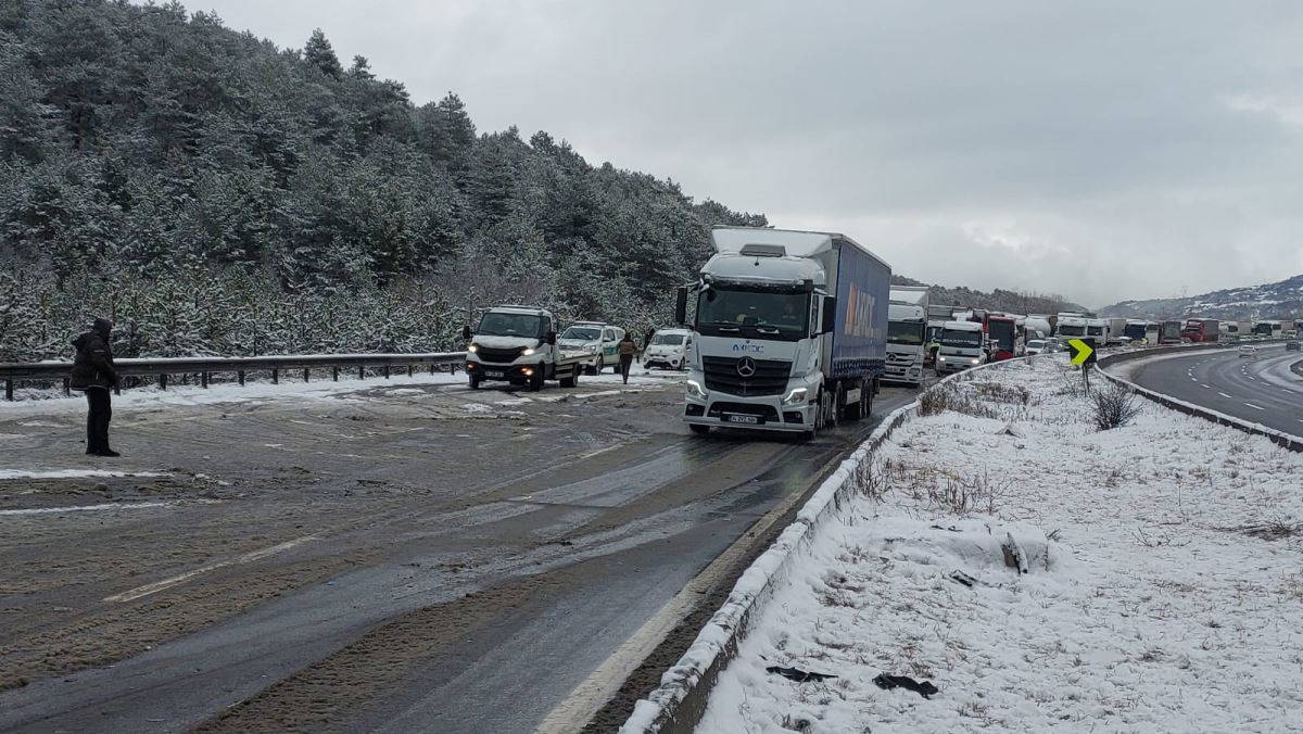Yoğun kar yağışının devam ettiği otoyolun İstanbul yönü kaza sebebiyle ulaşıma kapatıldı. Kilometrelerce araç kuyruğu oluştu.