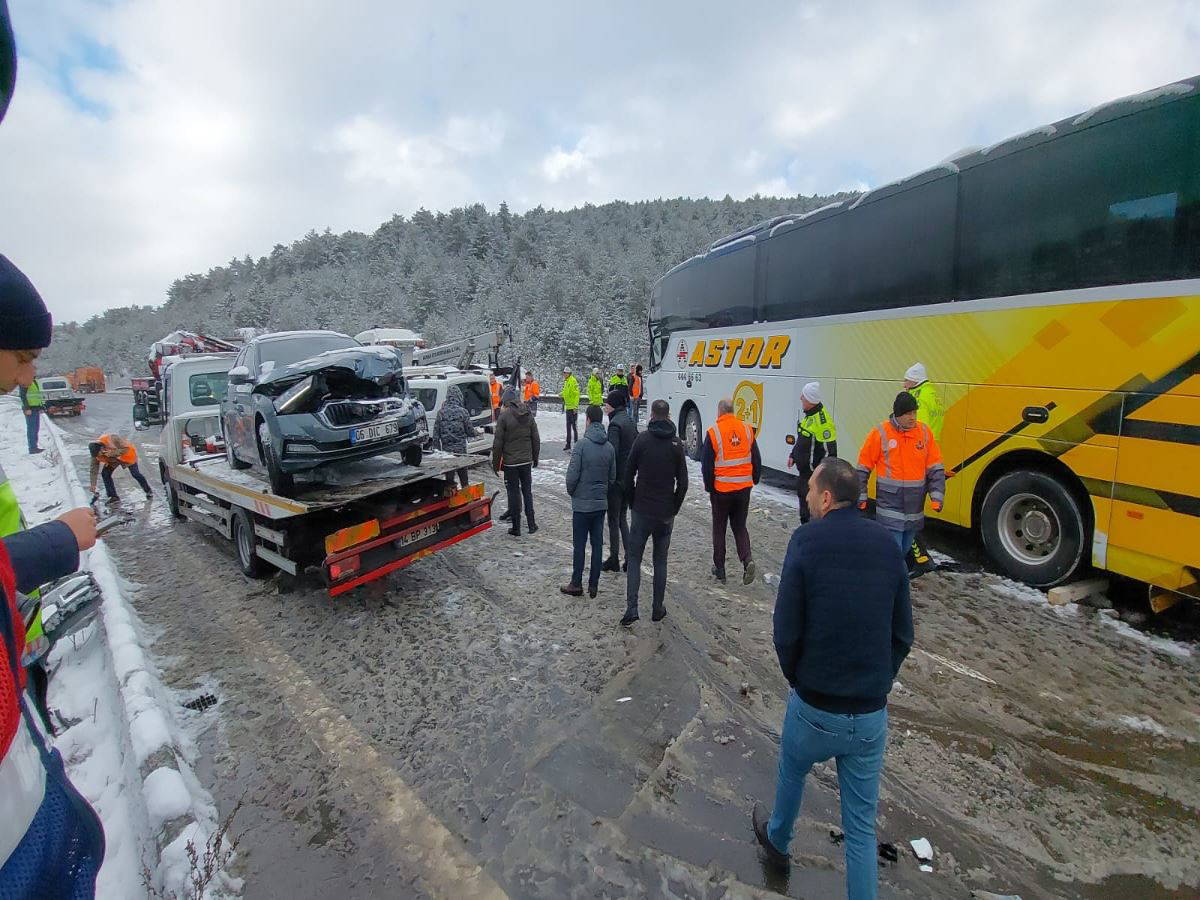 Daha sonra arkasından gelen 3 otomobil, 1 TIR ve 1 yolcu otobüsü de kazaya karıştı. Kazada ilk belirlemelere göre 5 kişi yaralandı.