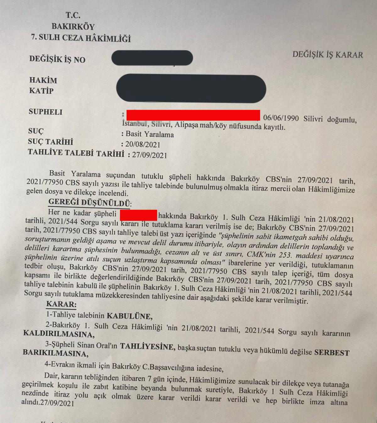Silivri'de yakalanan zanlı S.O, tutuklandı. Saldırgan S.O, çıkarıldığı Bakırköy 7. Sulh Ceza Hakimliği'nce serbest bırakıldı.