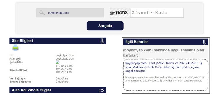 Bilgi Teknolojileri ve İletişim Kurumu (BTK) sitesinde sorgulandığında ise mahkeme kararı ile boykot.com sitesine erişim engeli getirildiği görüldü.