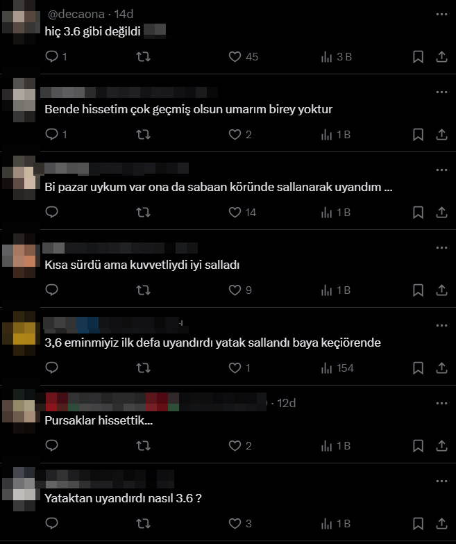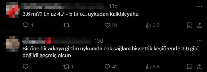 Birçok yurttaş, “3.6 mi? En az 4.7-5 tir o... uykudan kalktık yahu”, “Bir öne bir arkaya gittim uykumda çok sağlam hissettik Keçiören’de 3.6 gibi değildi geçmiş olsun”, “Bi pazar uykum var ona da sabahın köründe sallanarak uyandım” yorumlarını yaptı.