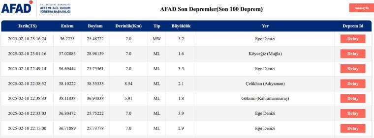 AFAD'ın paylaştığı verilere göre son depremler şu şekilde kaydedildi: