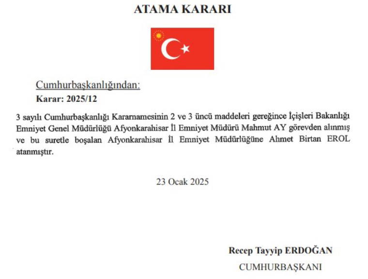 Erdoğan imzalı kararda, Afyonkarahisar İl Emniyet Müdürü Mahmut Ay görevden alındı, yerine Ahmet Birtan Erol atandı.