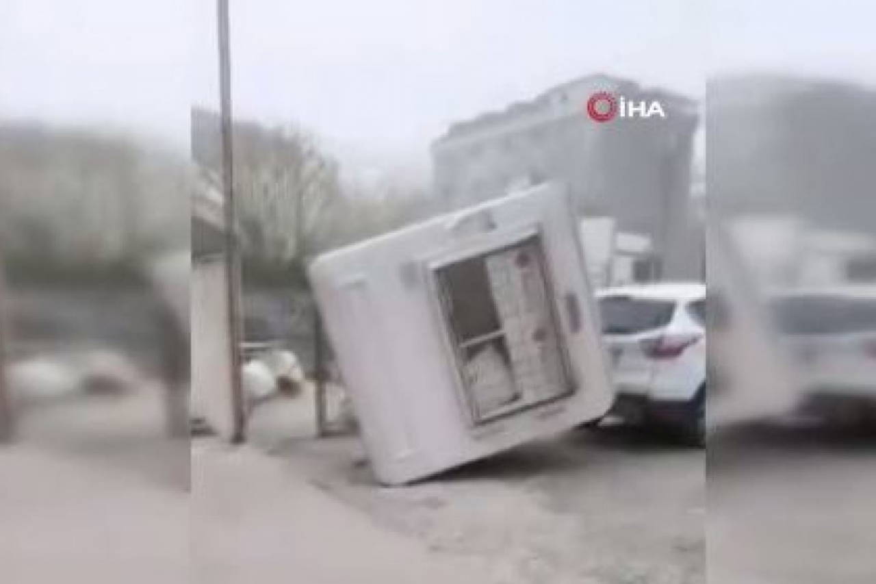 Avcılar Firuzköy’de bir iş yerinin bahçesinde bulunan güvenlik kulübesi, içinde görevli varken uçtu.