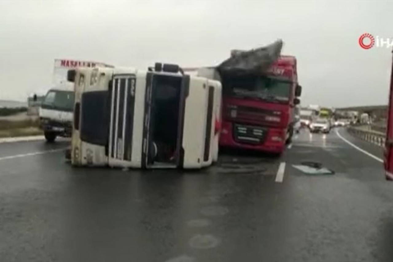 Çatalça Büyükçekmece İstikameti Tem Bağlantı Yolu’nda seyir halinde bulunan 2 tır bir kamyonet lodos nedeniyle devrildi. Araç içinde bulunan sürücüler kazayı hafif sıyrıklarla atlattı. Kaza nedeniyle bölge de trafik yoğunluğu yaşandı.