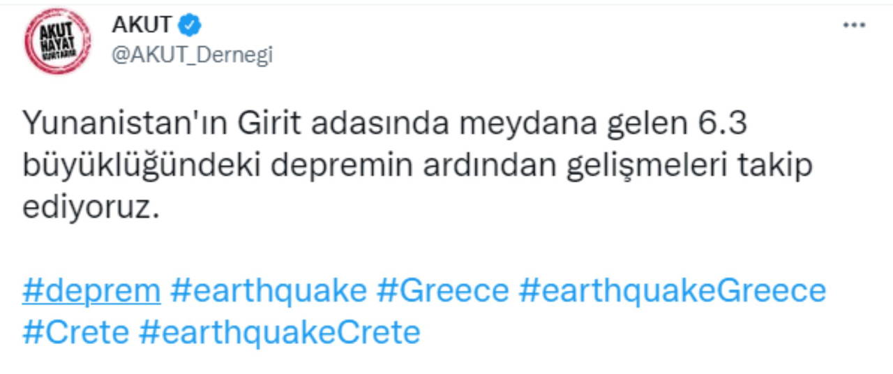 AKUT yaptığı açıklamada, "Yunanistan'ın Girit adasında meydana gelen 6.3 büyüklüğündeki depremin ardından gelişmeleri takip ediyoruz." ifadelerini kullandı.