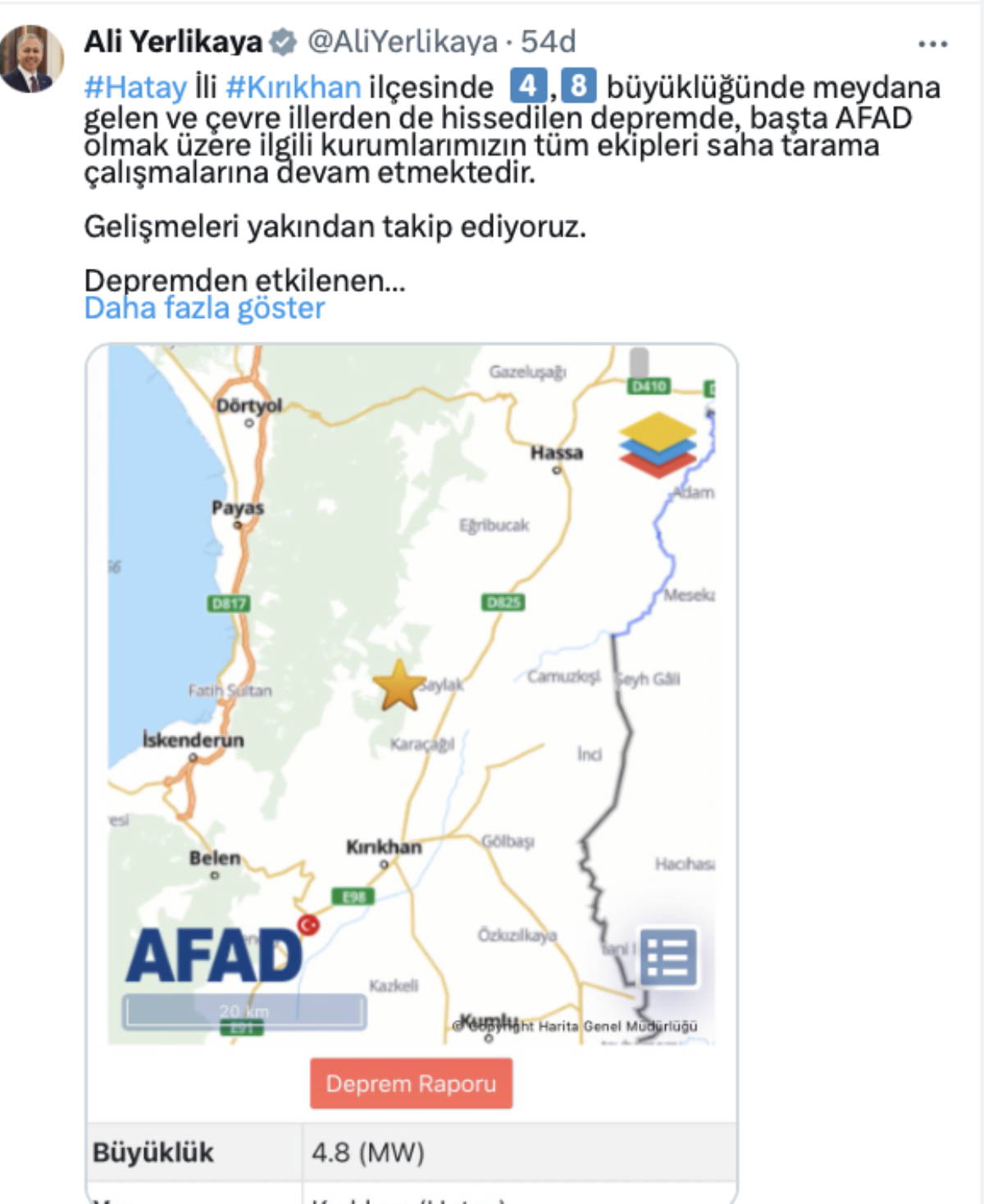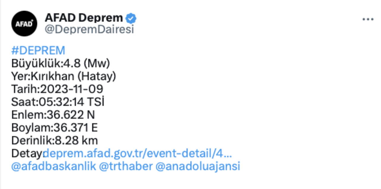 AFAD tarafından yapılan açıklamada, "Hatay ilimizin Kırıkhan ilçesinde saat 05.32'de meydana gelen 4.8 büyüklüğündeki deprem sonrası, an itibarıyla, olumsuz bir durum bulunmamaktadır. Saha tarama çalışmaları devam etmektedir. Vatandaşlarımıza geçmiş olsun dileklerimizi sunarız" denildi.