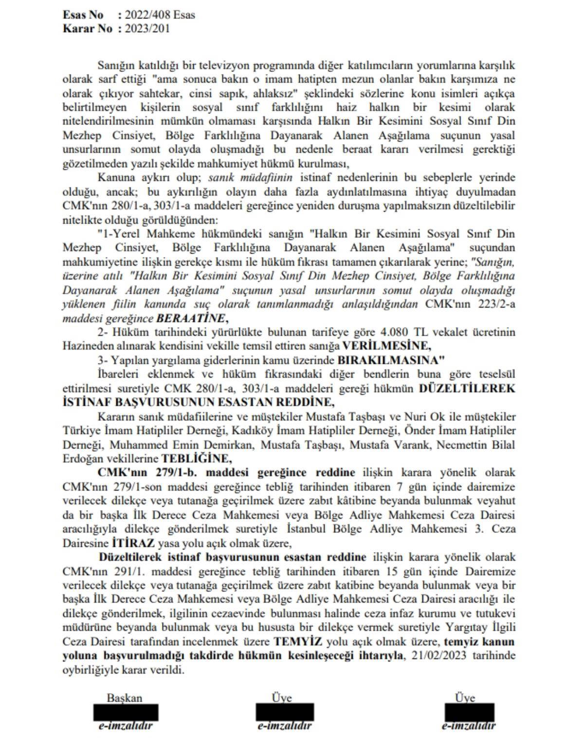 Gerekçeli kararda "Sanığın, üzerine atılı 'Halkın Bir Kesimini Sosyal Sınıf Din Mezhep Cinsiyet, Bölge Farklılığına Dayanarak Alenen Aşağılama' suçunun yasal unsurlarının somut olayda oluşmadığı yüklenen fiilin kanunda suç olarak tanımlanmadığı anlaşıldığından CMK'nın 223/2-a maddesi gereğince beraatine karar verilmiştir’’ ifadeleri yer aldı.
