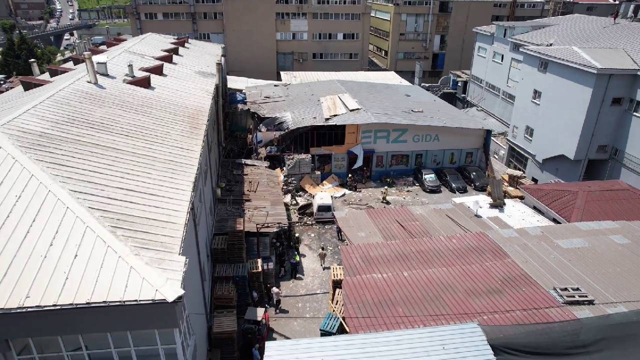 Yaşanan patlamanın yol açtığı hasar, havadan görüntülendi. Görüntülerde atölyenin yanında bulunan gıda deposunun büyük hasar aldığı görüldü.