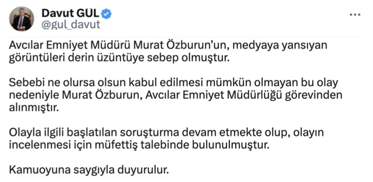 "Avcılar Emniyet Müdürü Murat Özburun’un, medyaya yansıyan görüntüleri derin üzüntüye sebep olmuştur. Sebebi ne olursa olsun kabul edilmesi mümkün olmayan bu olay nedeniyle Murat Özburun, Avcılar Emniyet Müdürlüğü görevinden alınmıştır. Olayla ilgili başlatılan soruşturma devam etmekte olup, olayın incelenmesi için müfettiş talebinde bulunulmuştur. Kamuoyuna saygıyla duyurulur."