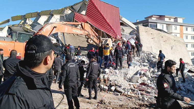 Doğukent Mahallesi'nde yıkım kararı verilen 7 katlı bina, kontrollü yıkım çalışması sırasında iş makinesinin üzerine çöktü.