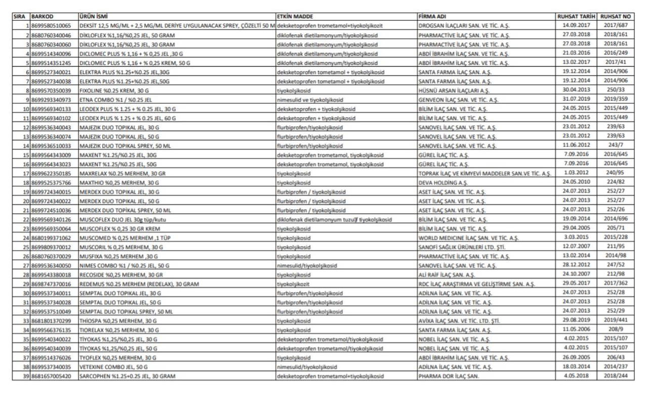 Yapılan açıklamada ''Tiyokolşikosid içeren topikal ürünler hakkında Kurumumuz ilgili bilimsel komisyonunca alınan kararlar doğrultusunda ilgili ürünlerin ruhsatları askıya alınmış olup, piyasada bulunan tüm partilerine 19 Kasım 2015 tarihli ve 29537 sayılı Resmi Gazetede yayımlanan Geri Çekme Yönetmeliği’ ne göre 3. Sınıf B seviyesinde geri çekme işlemi uygulanmıştır'' denildi.
