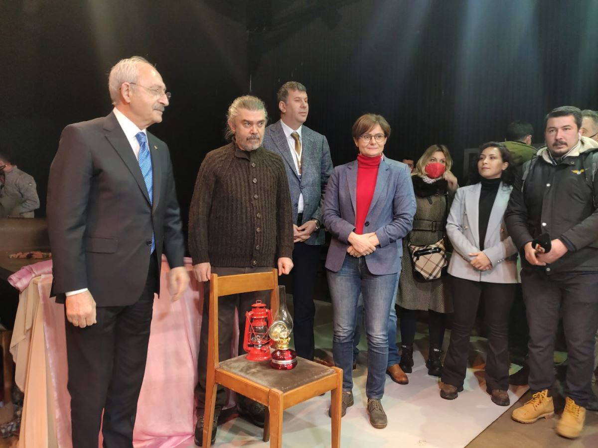 Tiyatro sahnesini gezen Kılıçdaroğlu, yanında getirdikleri bir kandil ve feneri, Moda Sahnesi Sanat Yönetmeni Kemal Aydoğan'a verdi.