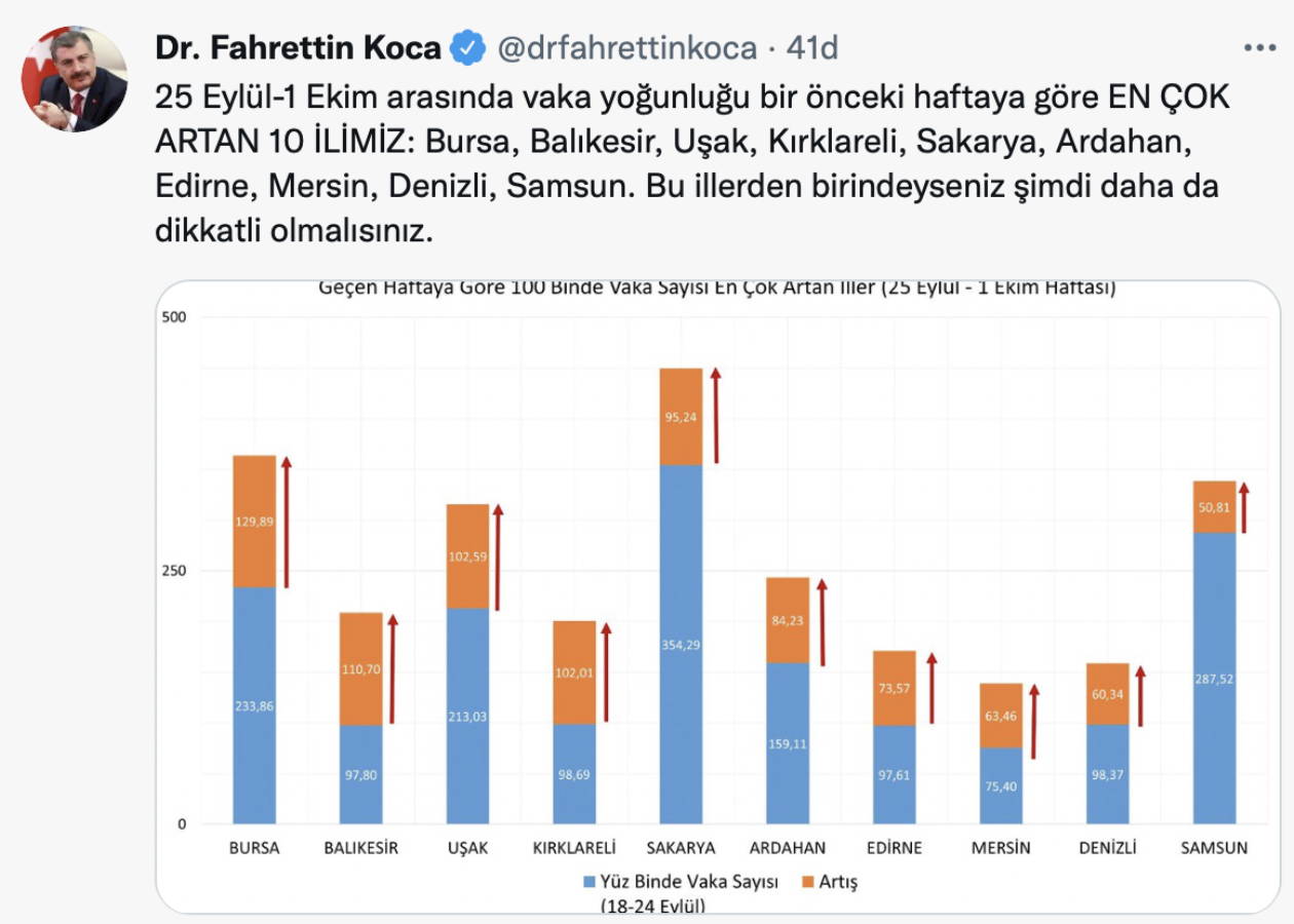 Sağlık Bakanı Koca, Twitter'daki hesabından, 25 Eylül ile 1 Ekim arasında illere göre her 100 bin kişide görülen Covid-19 vaka sayılarının güncellendiği haritayı paylaştı. Haritaya göre, 100 bin kişide vaka sayısı İstanbul'da 252,11, Ankara'da 363,69, İzmir'de 47,01 oldu. Vaka sayısı en çok artan iller ise Bursa, Balıkesir, Uşak, Kırklareli, Sakarya, Ardahan, Edirne, Mersin, Denizli, Samsun oldu. Bu illerde vaka oranları; Bursa 363,75, Uşak 315,62, Balıkesir 208,50, Kırklareli 200,70, Sakarya 449,53, Ardahan 243,34, Edirne 171,18, Mersin 138,86, Denizli 158,71, Samsun 338,33 olarak kayıtlara geçti.
