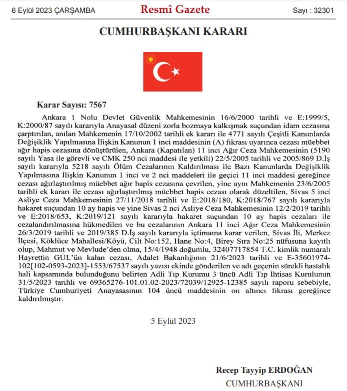 "Ankara 1 Nolu Devlet Güvenlik Mahkemesinin 16/6/2000 tarihli ve E:1999/5, K:2000/87 sayılı kararıyla Anayasal düzeni zorla bozmaya kalkışmak suçundan idam cezasına çarptırılan, anılan Mahkemenin 17/10/2002 tarihli ek kararı ile 4771 sayılı Çeşitli Kanunlarda Değişiklik Yapılmasına İlişkin Kanunun 1 inci maddesinin (A) fıkrası uyarınca cezası müebbet ağır hapis cezasına dönüştürülen, Ankara (Kapatılan) 11 inci Ağır Ceza Mahkemesinin (5190 sayılı Yasa ile görevli ve CMK 250 nci maddesi ile yetkili) 22/5/2005 tarihli ve 2005/869 D.İş sayılı kararıyla 5218 sayılı Ölüm Cezalarının Kaldırılması ile Bazı Kanunlarda Değişiklik Yapılmasına İlişkin Kanunun 1 inci ve 2 nci maddeleri ile geçici 11 inci maddesi gereğince cezası ağırlaştırılmış müebbet ağır hapis cezasına çevrilen, yine aynı Mahkemenin 23/6/2005 tarihli ek kararı ile cezası ağırlaştırılmış müebbet hapis cezası olarak düzeltilen, Sivas 5 inci Asliye Ceza Mahkemesinin 27/11/2018 tarihli ve E:2018/180, K:2018/767 sayılı kararıyla hakaret suçundan 10 ay hapis ve yine Sivas 2 nci Asliye Ceza Mahkemesinin 12/2/2019 tarihli ve E:2018/653, K:2019/121 sayılı kararıyla hakaret suçundan 10 ay hapis cezaları ile cezalandırılmasına hükmedilen ve bu cezalarının Ankara 11 inci Ağır Ceza Mahkemesinin 26/3/2019 tarihli ve 2019/385 D.İş sayılı kararıyla içtimaına karar verilen, Sivas İli, Merkez İlçesi, Köklüce Mahallesi/Köyü, Cilt No:152, Hane No:4, Birey Sıra No:25 nüfusuna kayıtlı olup, Mahmut ve Mevlude'den olma, 15/4/1948 doğumlu, 32407717854 T.C. kimlik numaralı Hayrettin GÜL'ün kalan cezası, Adalet Bakanlığının 21/6/2023 tarihli ve E-35601974- 102[102-0593-2023]-1553/67537 sayılı yazısı ekinde gönderilen ve adı geçenin sürekli hastalık hali kapsamında bulunduğunu belirten Adli Tıp Kurumu 3 üncü Adli Tıp İhtisas Kurulunun 31/5/2023 tarihli ve 69365276-101.01.02-2023/72039/12925-12385 sayılı raporu sebebiyle, Türkiye Cumhuriyeti Anayasasının 104 üncü maddesinin on altıncı fıkrası gereğince kaldırılmıştır."