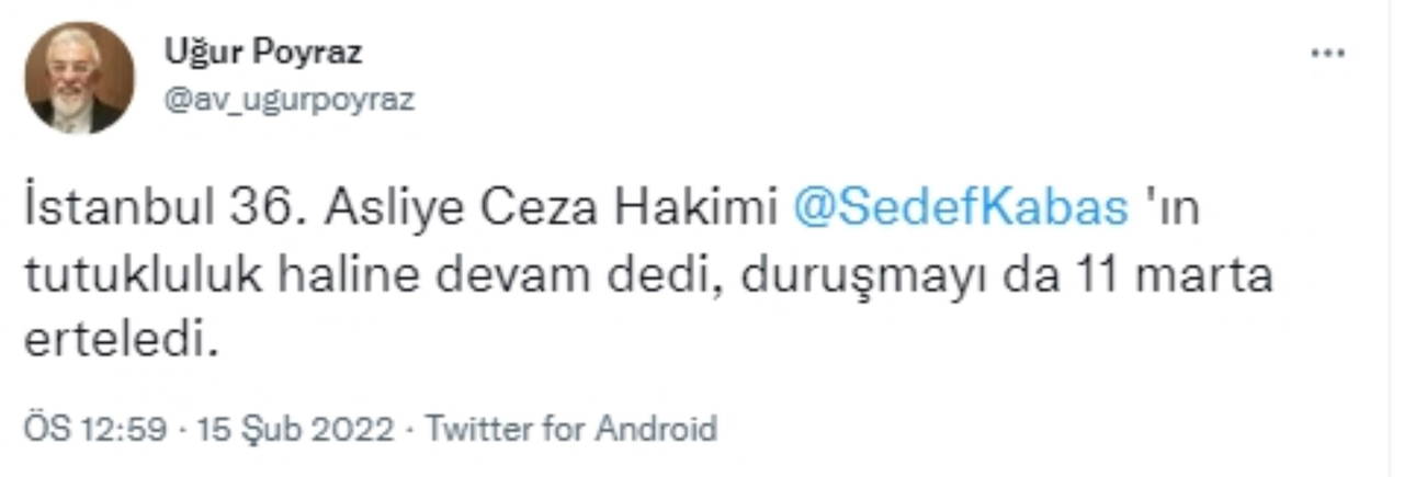 Sedef Kabaş'ın avukatı Uğur Poyraz'ın Twitter hesabından yaptığı açıklamaya göre, tutukluluk haline itirazda bulunulan Sedef Kabaş'la ilgili İstanbul 36. Asliye Ceza Mahkemesi'nden ret yanıtı geldi.
