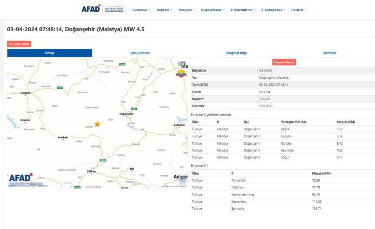 Afet ve Acil Durum Yönetimi Başkanlığı'nın (AFAD) verilerine göre, saat 10.48'de merkez üssü Doğanşehir ilçesi olan 4.5 büyüklüğünde deprem meydana geldi.