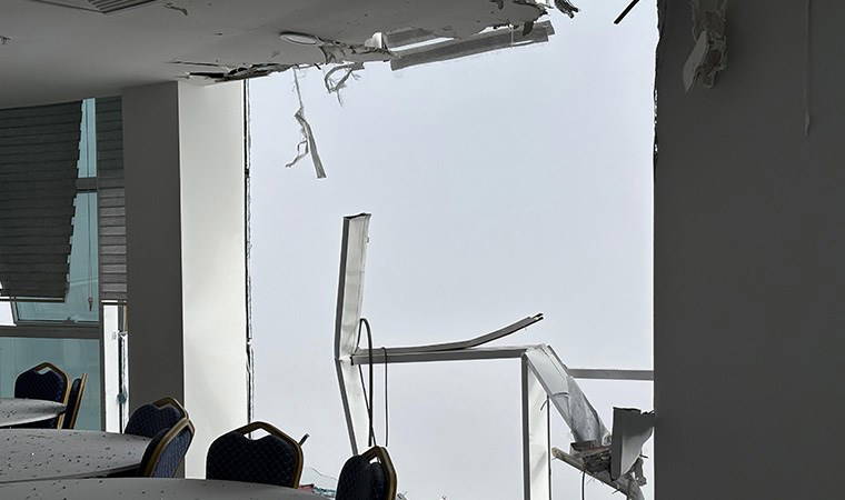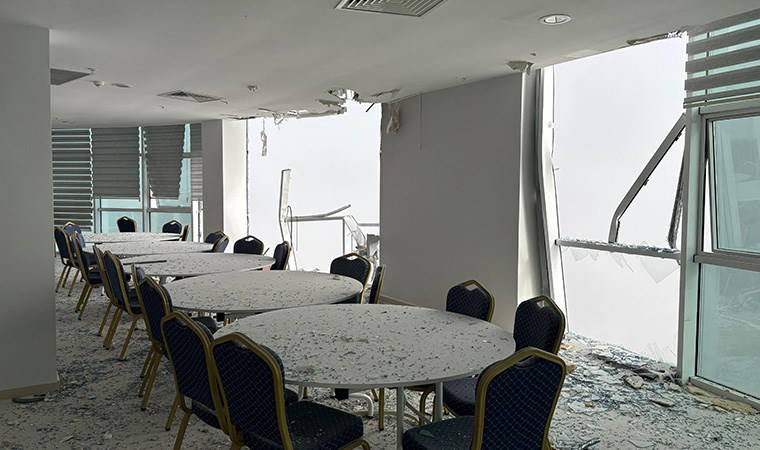 Görüntülerde hastane içindeki, duvar ve pencerelerdeki tahribat yer alıyor.
