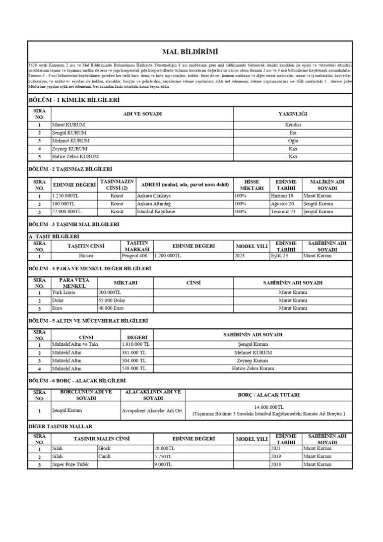 Mal bildiriminde ayrıca, Murat Kurum'un 200 bin Türk lirası ile 55 bin dolar ve 40 bin Euro'ya sahip olduğu belirtilirken, eşi Şengül Kurum'un 1 milyon 910 bin lira değerinde muhtelif altın ve takıya sahip olduğu bilgisi de yer alıyor.