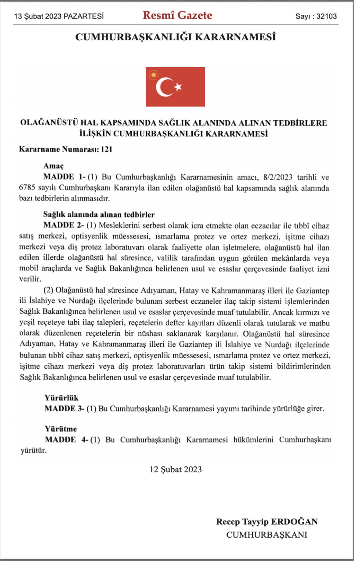 Olağanüstü hal süresince Adıyaman, Hatay ve Kahramanmaraş illeri ile Gaziantep ili İslahiye ve Nurdağı ilçelerinde bulunan tıbbî cihaz satış merkezi, optisyenlik müessesesi, ısmarlama protez ve ortez merkezi, işitme cihazı merkezi veya diş protez laboratuvarları ürün takip sistemi bildirimlerinden Sağlık Bakanlığınca belirlenen usul ve esaslar çerçevesinde muaf tutulabilecek.