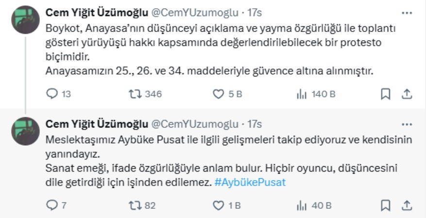 Boykot paylaşımı nedeniyle TRT 1'deki Teşkilat dizisinden çıkarılan Aybüke Pusat'a da destek veren ünlü oyuncu, "Meslektaşımız Aybüke Pusat ile ilgili gelişmeleri takip ediyoruz ve kendisinin yanındayız. Sanat emeği, ifade özgürlüğüyle anlam bulur. Hiçbir oyuncu, düşüncesini dile getirdiği için işinden edilemez." demişti.