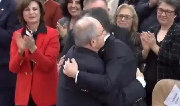 Özel ise, Büyükerşen’in elini öperek sarıldı.