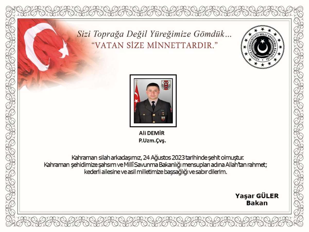 "Pençe-Kilit Operasyonu bölgesinde, 24 Ağustos 2023 tarihinde bir üs bölgesinden yol emniyetine çıkan unsurlara bölücü terör örgütü mensuplarınca açılan taciz ateşi sonucunda kahraman silah arkadaşımız Piyade Uzman Çavuş Ali Demir ağır yaralanmış ve kaldırıldığı hastanede yapılan tüm müdahalelere rağmen kurtarılamayarak şehit olmuştur. Bizleri derin bir acı ve üzüntüye boğan bu olayda hayatını kaybeden aziz şehidimize Allah'tan rahmet, kederli ailesine, Türk Silahlı Kuvvetleri ile asil milletimize başsağlığı ve sabır dileriz."