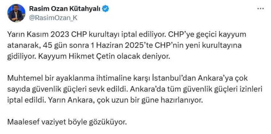 Soruşturmanın ardından X hesabından açıklama yapan Kütahyalı, "Böyle bir durumun olmadığı netleşmiştir. Yanlış bilgi. CHP kurultayının iptal ihtimali sıfır" ifadeleri ile yeni bir paylaşım daha yaptı.