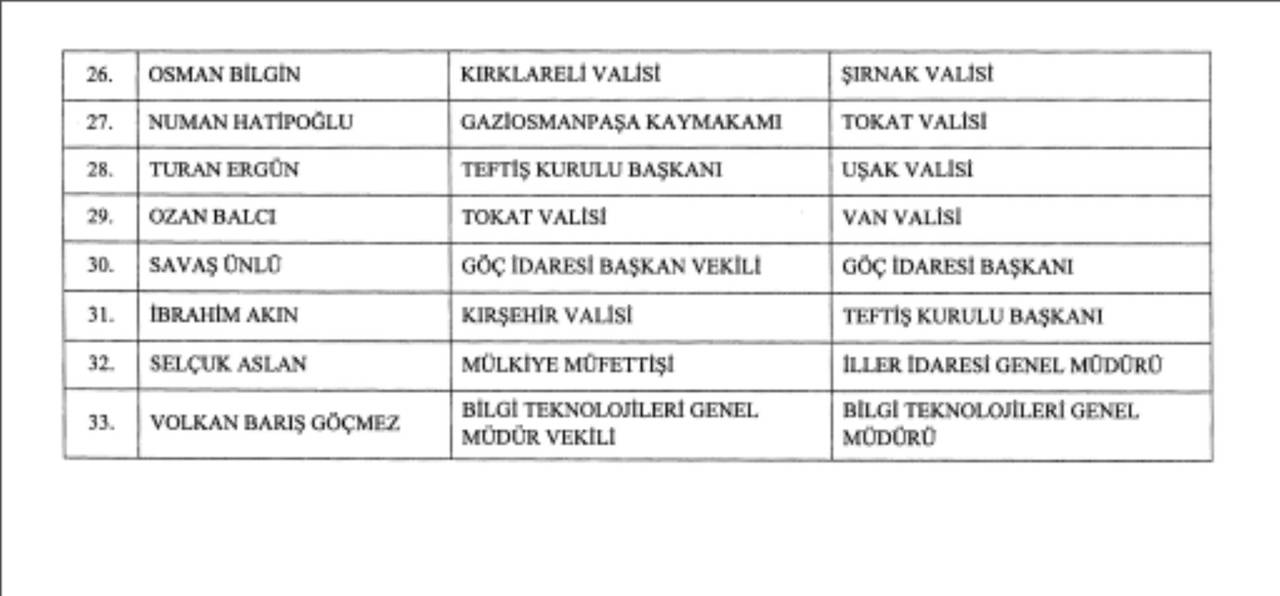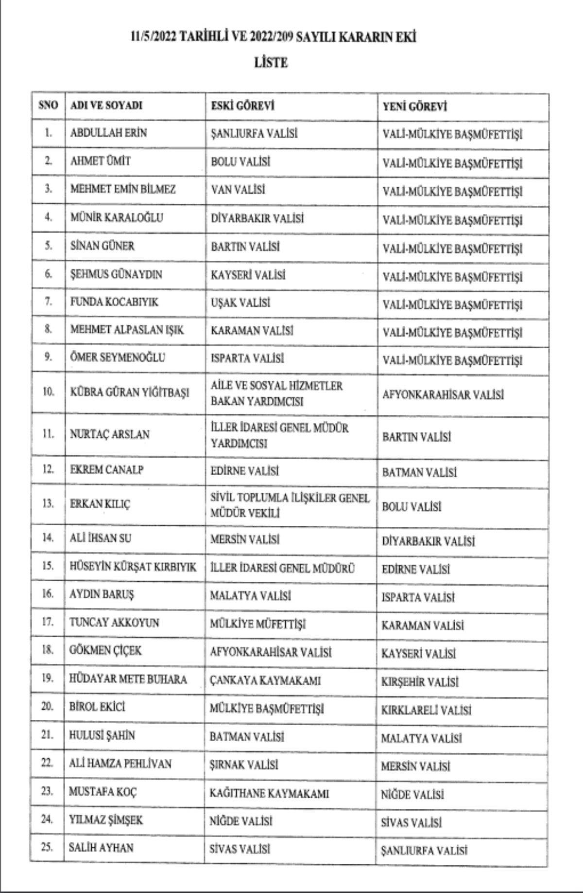 Ayrıca Şanlıurfa Valisi Abdullah Erin, Bolu Valisi Ahmet Ümit, Van Valisi Mehmet Emin Bilmez, Diyarbakır Valisi Münir Karaloğlu, Bartın Valisi Sinan Güner, Kayseri Valisi Şehmus Günaydın, Uşak Valisi Funda Kocabıyık, Karaman Valisi Mehmet Alpaslan Işık ve Isparta Valisi Ömer Seymen valilik görevinden alındı.