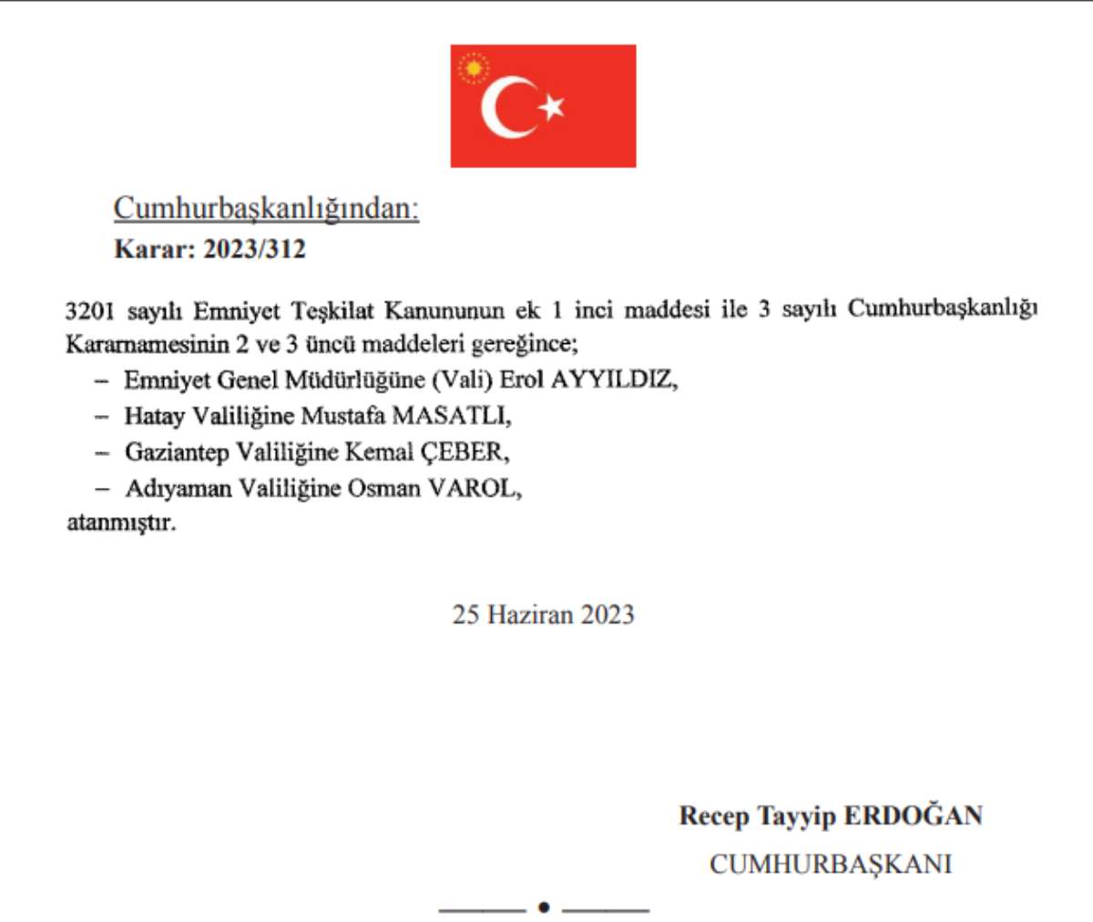 Emniyet Genel Müdürlüğü ve 3 ildeki vali atamaları, AKP Genel Başkanı ve Cumhurbaşkanı Recep Tayyip Erdoğan'ın imzasıyla Resmi Gazete'de yayımlandı. Buna göre, Emniyet Genel Müdürü Mehmet Aktaş'ın İçişleri Bakan Yardımcılığı'na getirilmesinin ardından Emniyet Genel Müdürlüğü görevine hali hazırda Eskişehir Valisi olarak görev yapan Erol Ayyıldız yeni Emniyet Genel Müdürü olarak atandı.