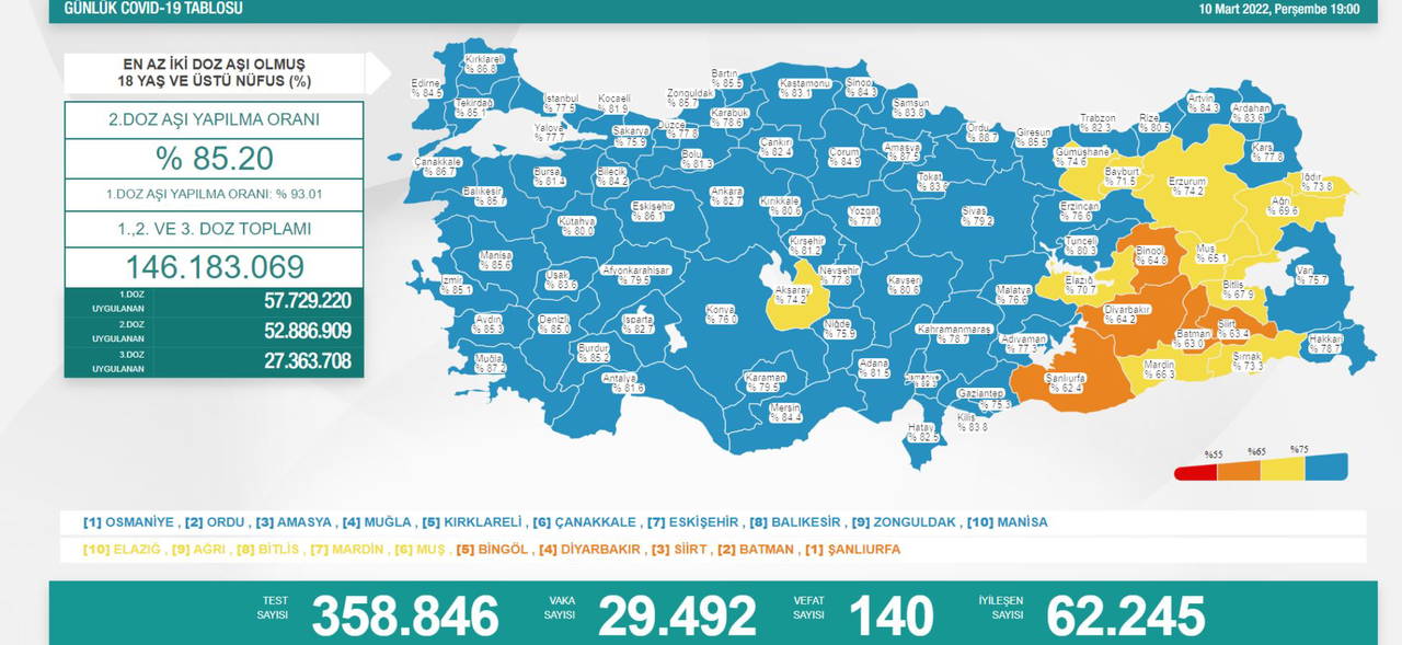 Türkiye'nin 10 Mart 2022 güncel koronavirüs tablosu şöyle:
