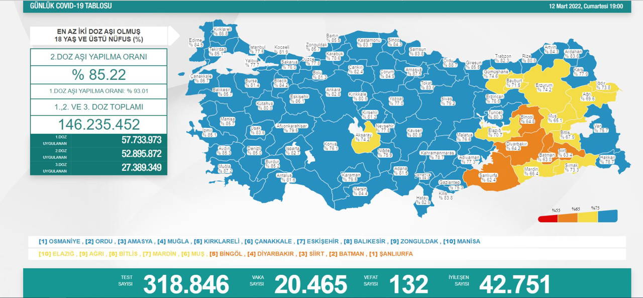 Türkiye'nin 12 Mart 2022 güncel koronavirüs tablosu şöyle:
