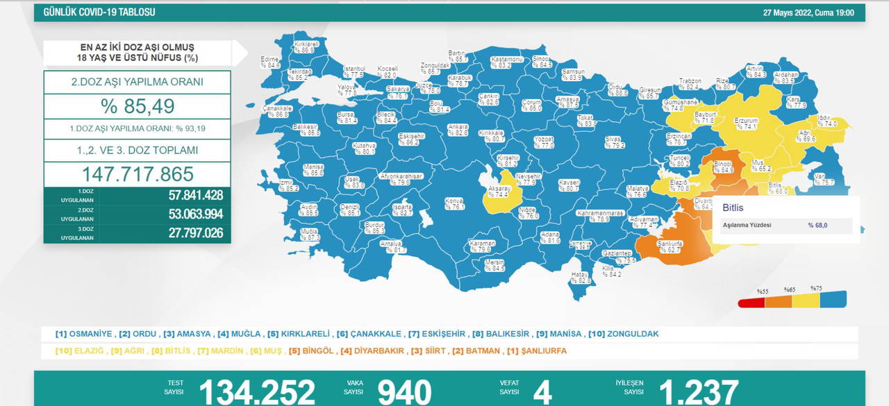 Türkiye'nin 27 Mayıs 2022 güncel koronavirüs tablosu şöyle: