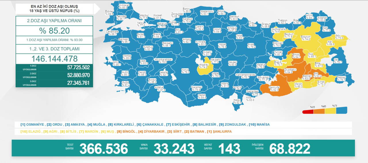 Bir günde toplam 366 bin 536 test yapılırken, iyileşen hasta sayısı 68 bin 822 olarak kaydedildi. Sağlık Bakanlığı tarafından açıklanan tabloda, 2 doz aşılama verilerine de yer verildi. En az 2 doz aşı olmuş 18 yaş üzeri nüfusu kapsayan verilere göre Türkiye'de 2. doz aşılama ortalama yüzde 85,20 oldu. 1. doz ortalaması yüzde 93,00 olurken, 1., 2. ve 3. doz aşısını olan vatandaş sayısı toplamda 146 milyon 097 bin 881’e yükseldi.