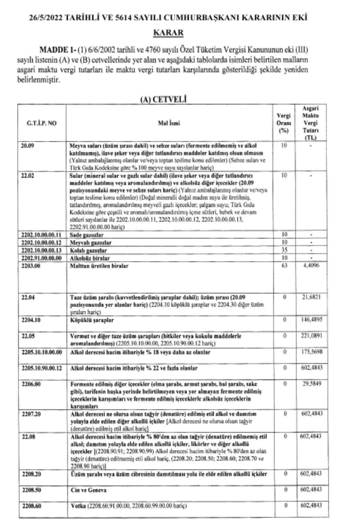 AKP'li Cumhurbaşkanı Recep Tayyip Erdoğan'ın imzasıyla Resmi Gazete’nin bugünkü sayısında yayımlanan kararına göre aralık ayı sonuna kadar sigara, alkollü içkiler ve içeceklerden alınan Özel Tüketim Vergisi (ÖTV) asgari maktu tutarları değiştirildi.