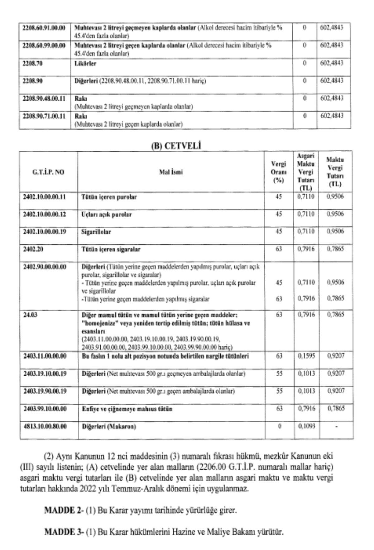 Bir litre rakıda ÖTV tutarı 481,98 TL'den 602,48 TL'ye yükseltildi. Sigarada 0.71 TL olan asgari maktu vergi tutarı 0.78 TL oldu.