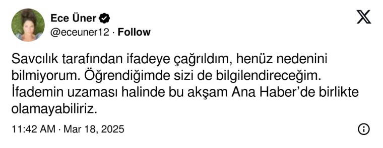 Sosyal medya hesabından açıklama yapan Üner "Savcılık tarafından ifadeye çağrıldım, henüz nedenini bilmiyorum. Öğrendiğimde sizi de bilgilendireceğim. İfademin uzaması halinde bu akşam Ana Haber’de birlikte olamayabiliriz" dedi.