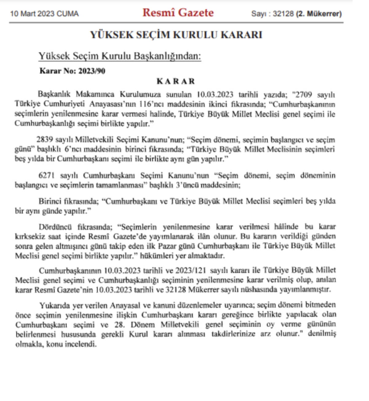 Resmî Gazete'de tebliğ edilen YSK kararına göre, seçim tarihi 14 Mayıs'ta ikinci tura kalırsa 28 Mayıs'ta yapılacak.