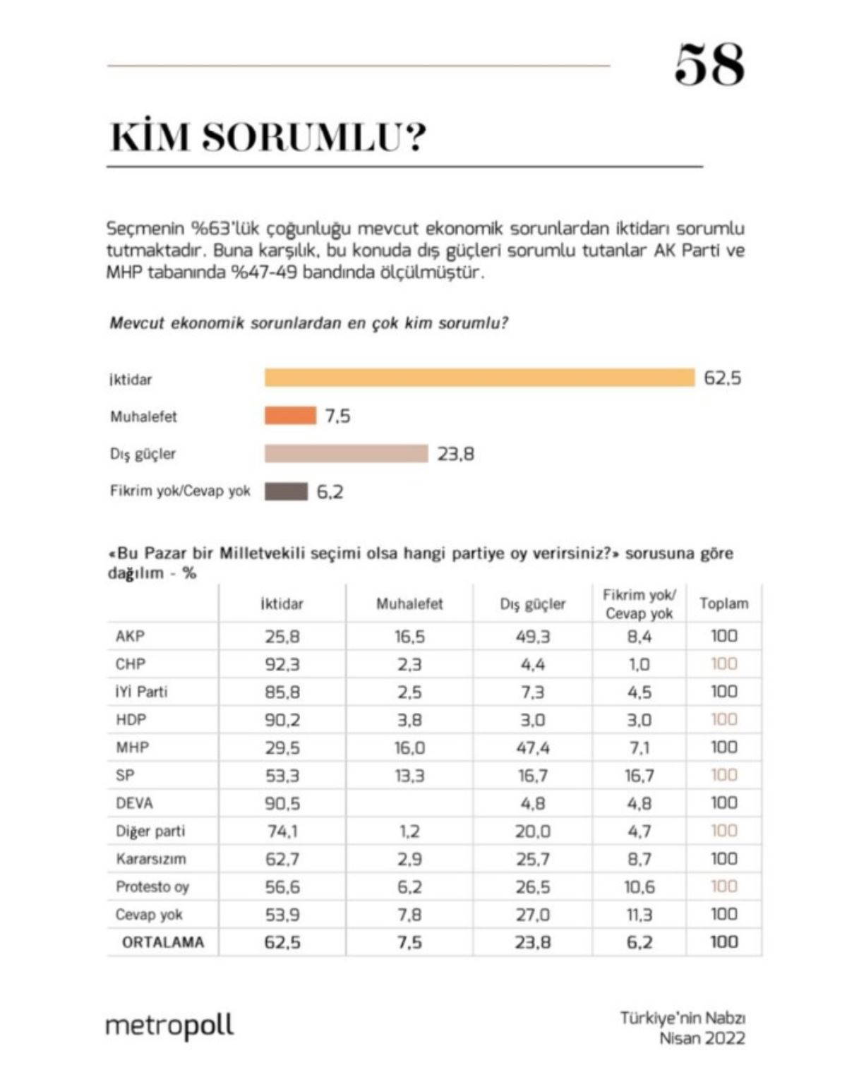 MetroPOLL Araştırma Şirketi, şiddetini artıran ekonomik krizle ilgili son anket sonuçlarını paylaştı. MetroPOLL Araştırma'nın sahibi Özer Sencar Twitter hesabından yaptığı paylaşımında, Türkiye'nin Nabzı Nisan 2022 Araştırması'nın sonuçlarını yayımladı. Katılımcılara, "Mevcut ekonomik sorunlarından en çok kim sorumlu" sorusu yöneltildi.