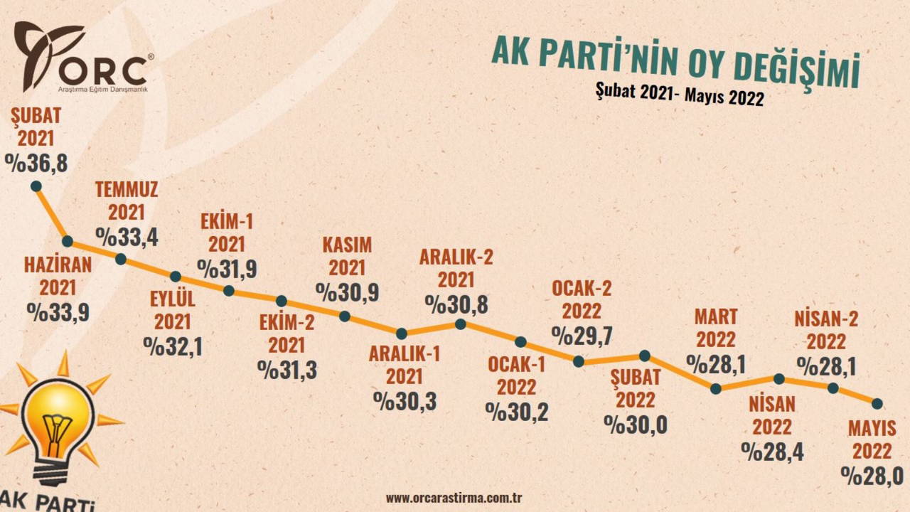En büyük değişim ise AKP'de yaşandı. AKP yüzde 8'den fazla oy kaybetti. Böylece, Şubat 2021'de 36.8 olan AKP oyu, yüzde 28'e geriledi.