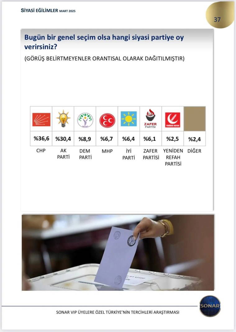 SONAR Araştırma'nın yaptığı ankette CHP'nin birinci parti olduğu görülürken; MHP'nin de baraj altında kaldığı görüldü. Özlem Gürses'in SZC TV'de paylaştığı SONAR Araştırma'nın yalnızca VIP üyelere gönderdiği anket sonuçları dikkat çekti.