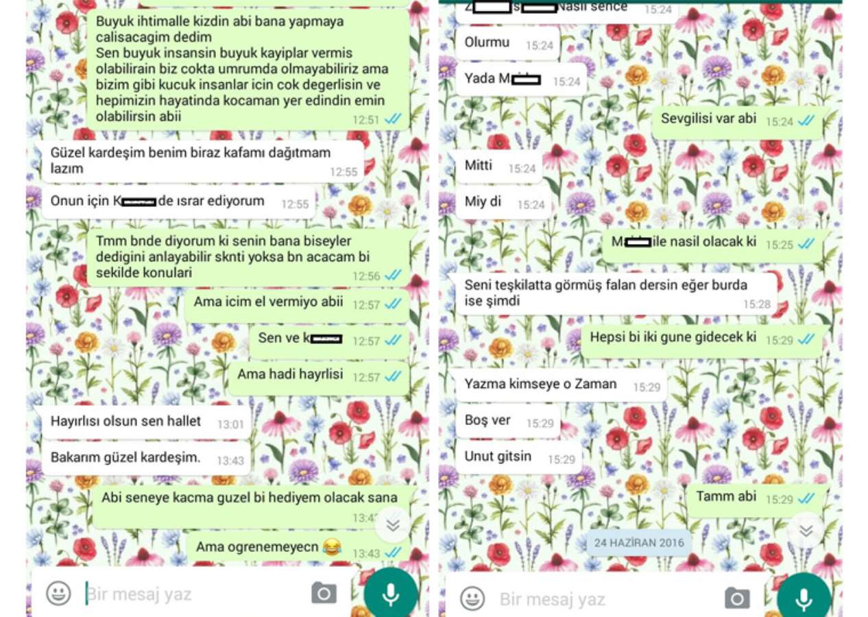 İddiasına göre; bu mesajlarda Ebubekir Öztürk (Koray Ak adıyla), öğrenciye ‘Bak senden hoşlanıyorum’ yazıyor. ‘Uff abi dalga geçme’ diye yanıt alınca ‘Ne dalgası ya. Bunun dalgası mı olur. Seni gerçekten çok beğeniyorum. Aklımdasın hep’ yazarak ısrar ediyor. Bu öğrenci, daha sonra Ebubekir Öztürk’e gönderdiği mesajda evli ve çocuğu olduğunu öğrendiğini anlatıyor. ‘Seni tanıdığım, abi dediğim güne lanet ediyorum’ yazıyor.