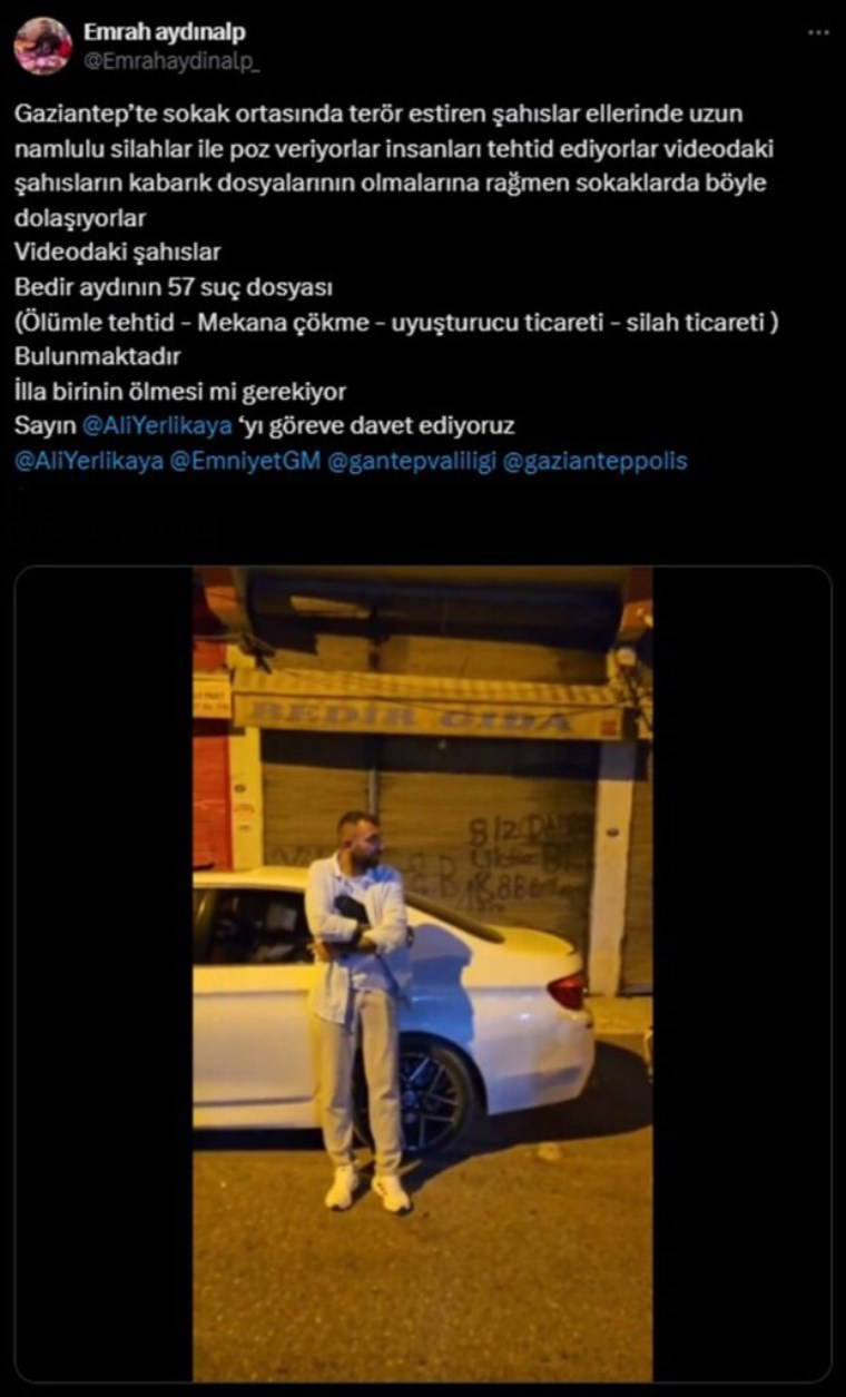 "Gaziantep’te sokak ortasında terör estiren şahıslar ellerinde uzun namlulu silahlar ile poz veriyorlar insanları tehdit ediyorlar. Videodaki şahısların kabarık dosyalarının olmalarına rağmen sokaklarda böyle dolaşıyorlar. Videodaki şahıslar Bedir aydının 57 suç dosyası (Ölümle tehdit-Mekana çökme-uyuşturucu ticareti-silah ticareti) bulunmaktadır. İlla birinin ölmesi mi gerekiyor?"