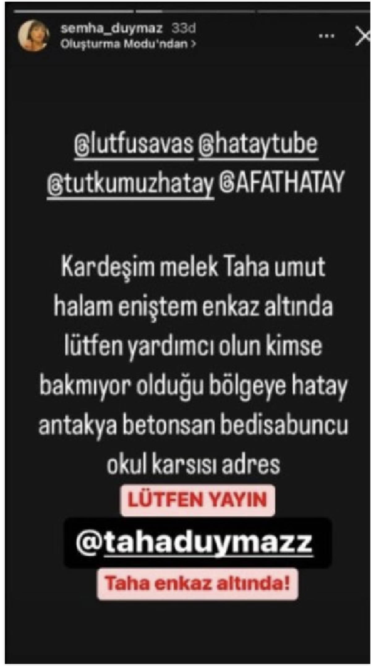 "Kardeşim Melek, Taha, Umut, halam ve eniştem enkaz altında. Lütfen yardımcı olun kimse bakmıyor olduğu bölgeye. Hatay Antakya, Betonsan Bedisabuncu Okul karşısı" diyerek, Taha enkaz altında."