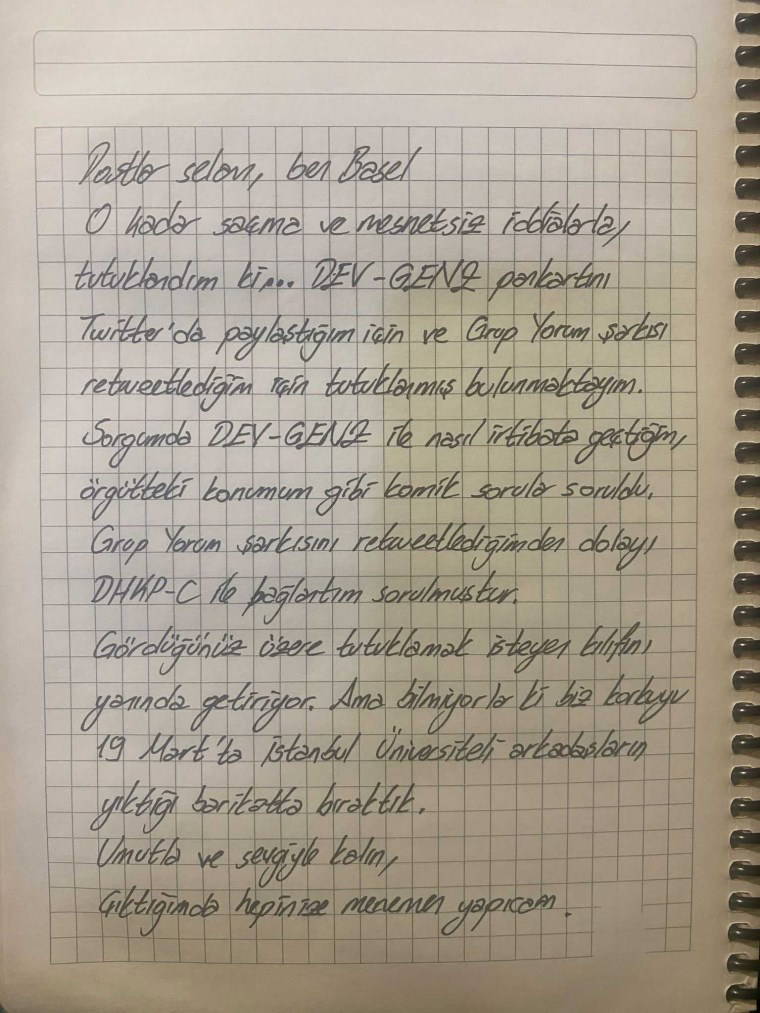 "O kadar saçma ve mesnetsiz iddalarla, tutuklandım ki... DEV-GENZ pankartını Twitter'da paylaştığım için ve Grup Yorum şarkısı retweetlediğim için tutuklanmış bulunmaktayım. Sorguda DEV-GENZ ile nasıl irtibata geçtiğim, örgütteki konumum gibi komik sorular soruldu. Grup Yorum şarkısını retweetlediğimden dolayı DHKP-C ile bağlantım sorulmustur. Gördüğünüz üzere tutuklamak isteyen kılıfını younda getiriyor. Ama bilmiyorlar ki biz korkuyu 19 Mart'a İstanbul üniversiteli arkadaşların yıktığı barikatta bıraktık. Umutla ve sevgiyle kalın. Çıktığımda hepinize menemen yapacağım."